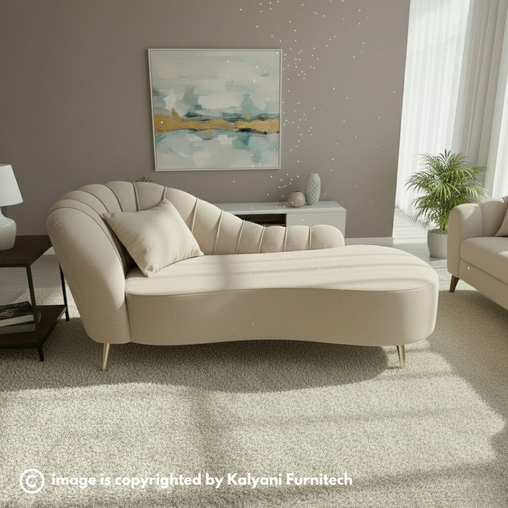 This chic chaise lounge is a statement piece, blending luxurious design with exceptional comfort. Upholstered in a soft, neutral beige fabric, it features a distinctive curved silhouette perfect for relaxing or reading. The backrest showcases elegant vertical channeling, reminiscent of a stylized seashell, adding a sophisticated, textured look.
